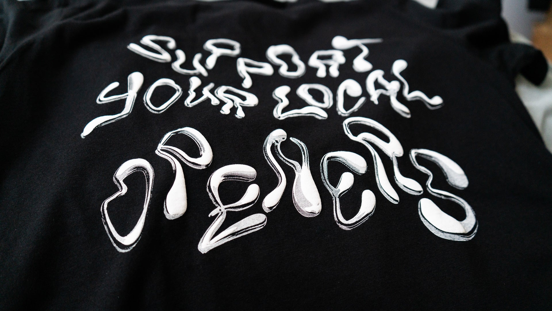 Screen printed by hand, printed on 100% combed and ring-spun cotton tees with a standard fit.  Printed with puff ink to give it a marshmallow-like vibe.
